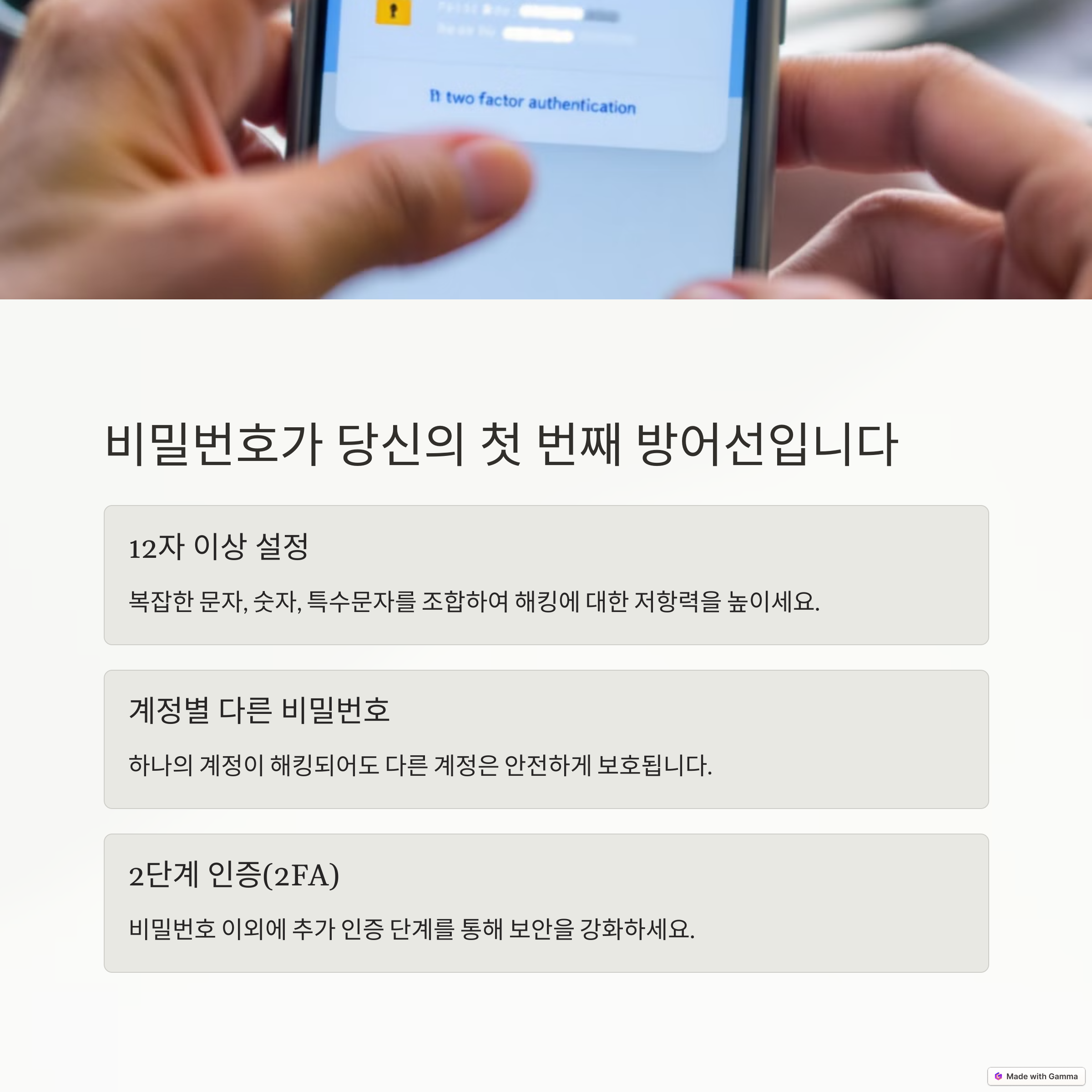 | 강력한 비밀번호 설정 필수 | 모든 계정에서 2FA 활성화 | 의심스러운 링크 클릭 금지 |