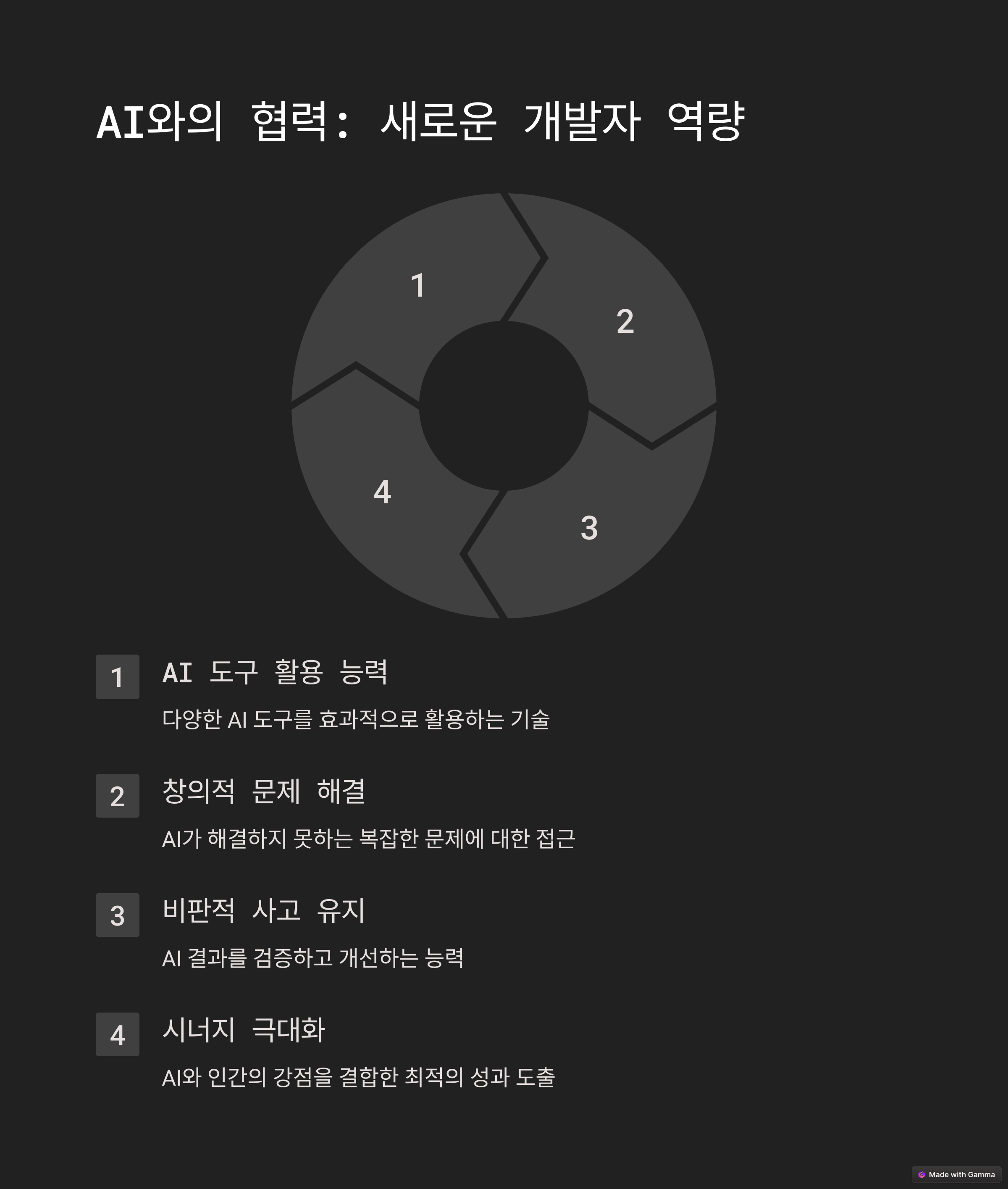 AI 자동화를 효과적으로 활용하기 위해서는 적절한 밸런스가 필요합니다. 반복적인 작업은 자동화하되, 중요한 의사 결정과 복잡한 문제 해결은 개발자가 직접 주도해야 합니다. AI의 도움을 받되, 이를 맹신하지 않는 것이 장기적으로 더 나은 결과를 가져올 것입니다.