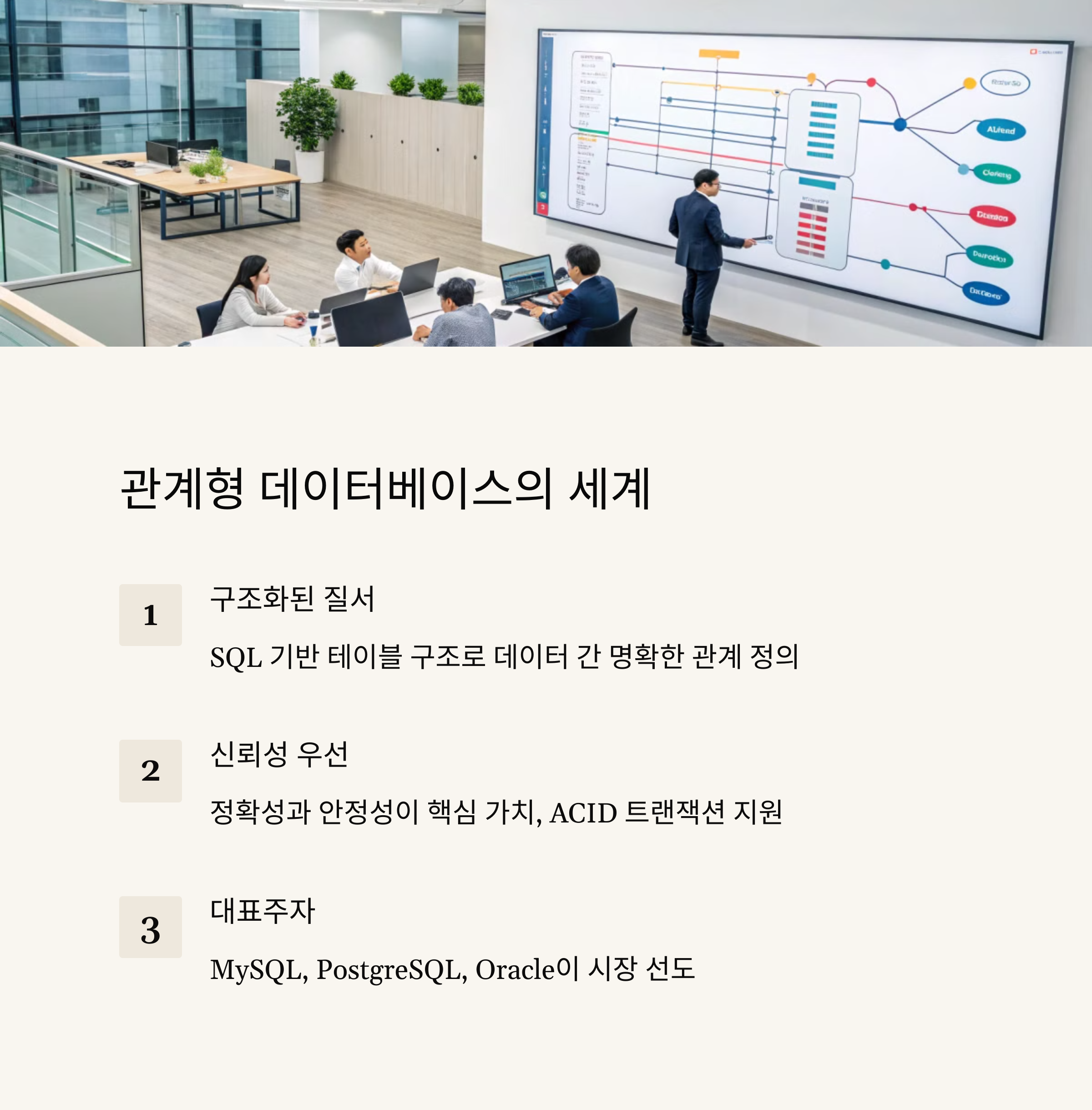 관계형 데이터베이스(RDBMS)는 데이터를 테이블 형식으로 저장하며, 정확성과 일관성이 중요한 시스템에서 사용됩니다. 대표적인 예로는 MySQL, PostgreSQL, Oracle, SQL Server 등이 있습니다. 이들은 강력한 트랜잭션 관리 기능을 제공하며, 정형화된 데이터를 처리하는데 최적화되어 있습니다.
