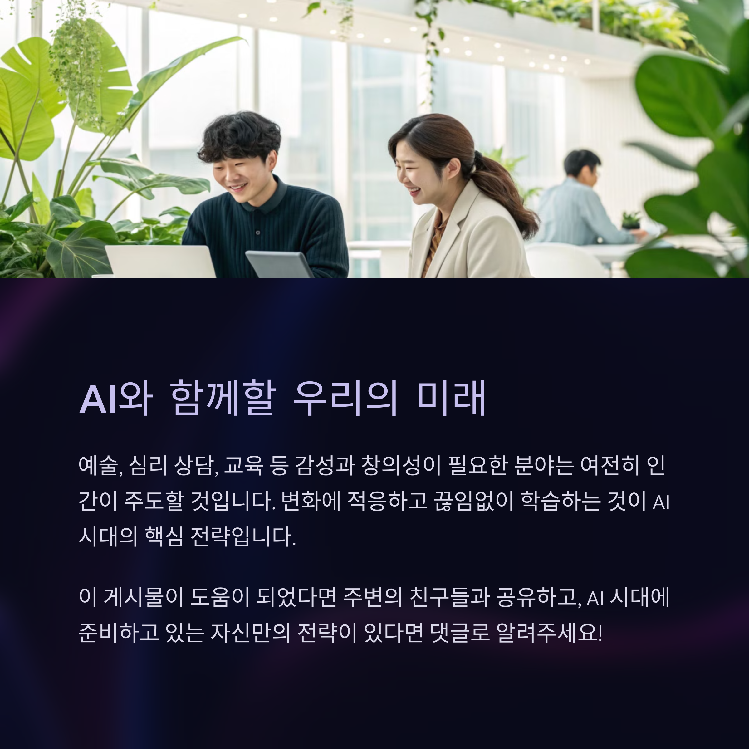 여러분은 AI가 미래의 일자리 시장에 어떤 영향을 미칠 것이라고 생각하시나요? AI와 함께 살아가기 위해 우리는 어떤 준비를 해야 할까요? 댓글로 여러분의 생각을 자유롭게 나눠 주세요!