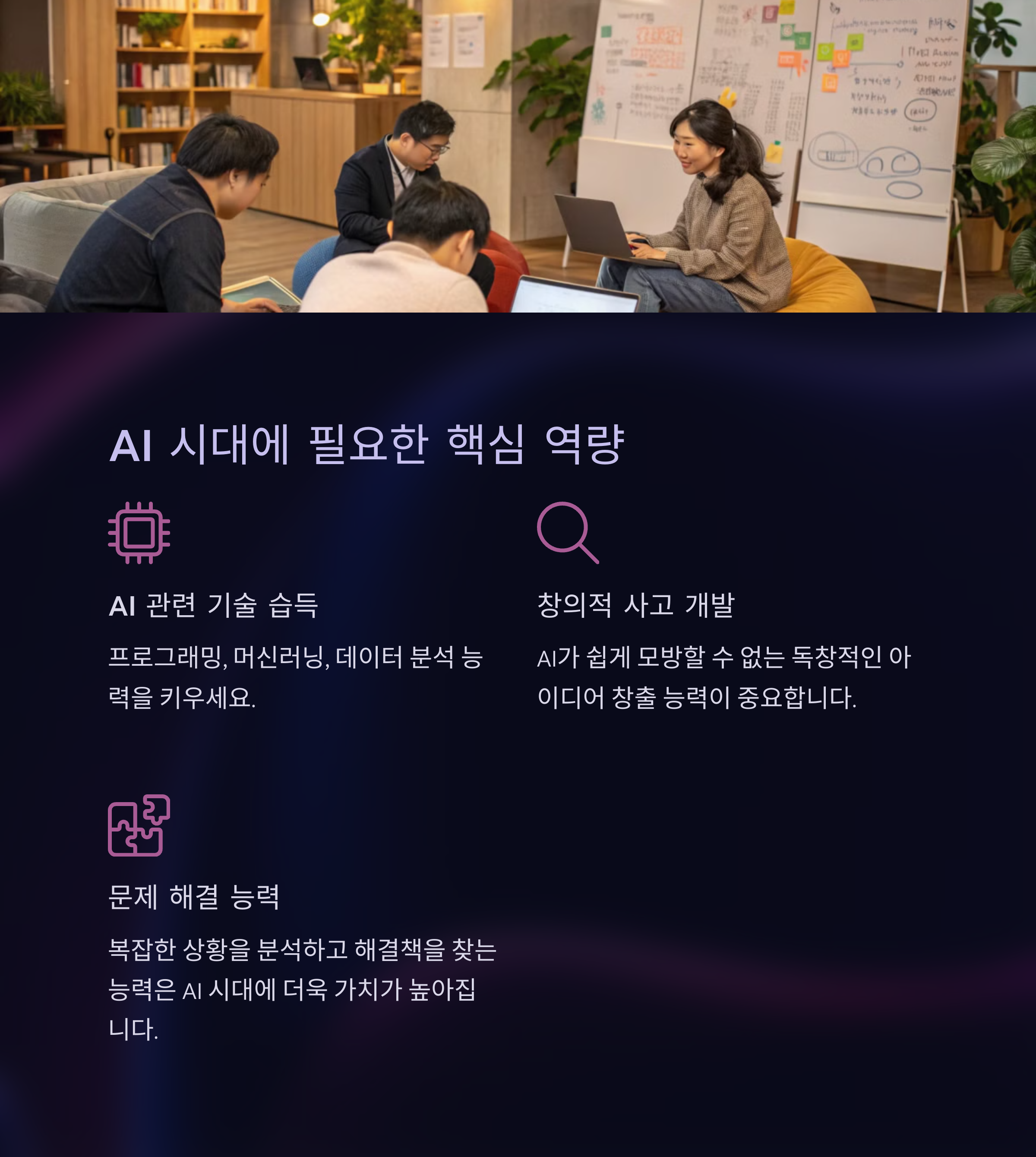 | 데이터 과학자, AI 전문가 | 단순 사무직, 콜센터 직원 | 새로운 기술 학습, 창의력 강화 |