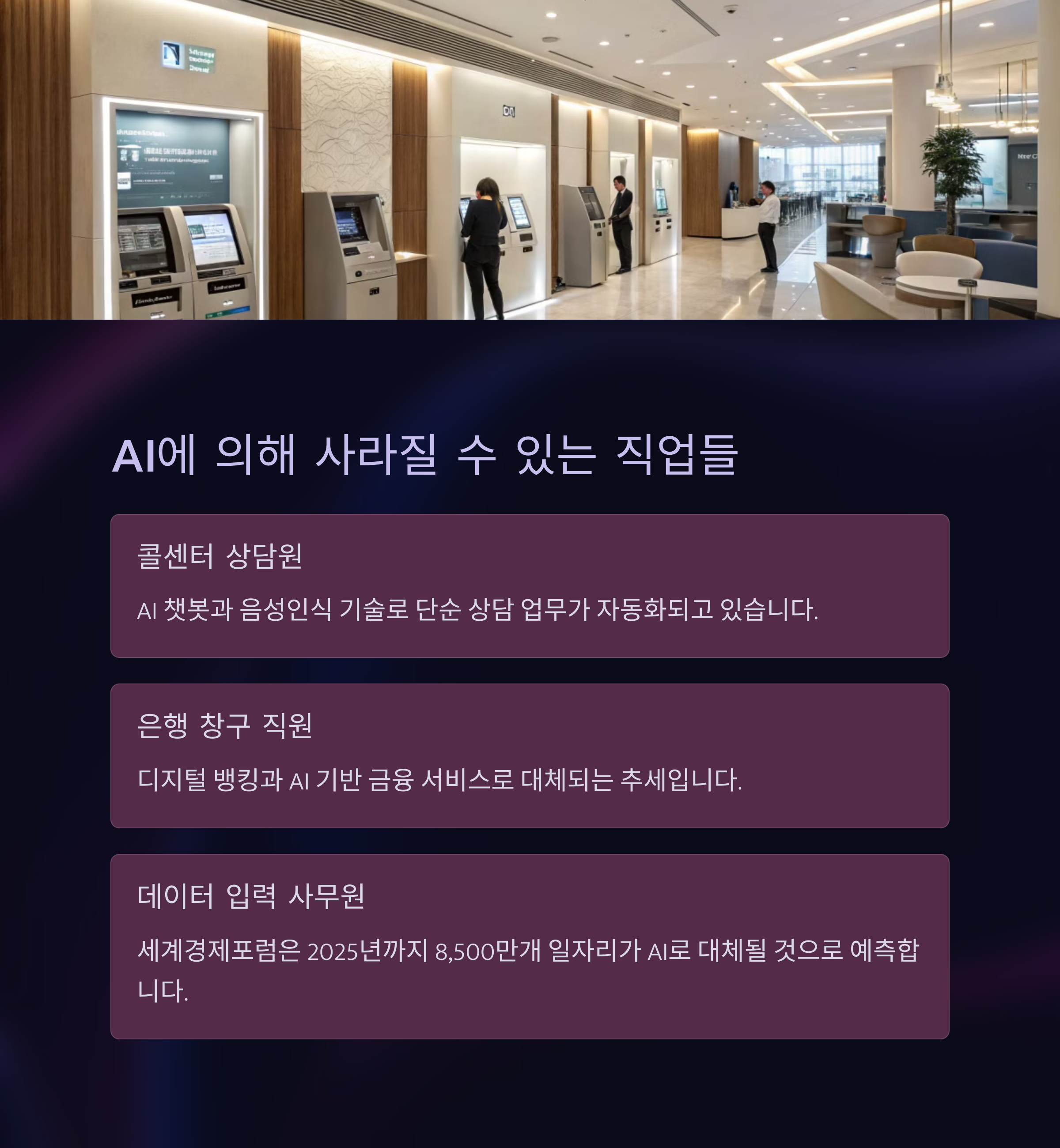 | 사라지는 직업 | 단순 반복 작업, 콜센터 상담원, 은행 창구 직원 등 |