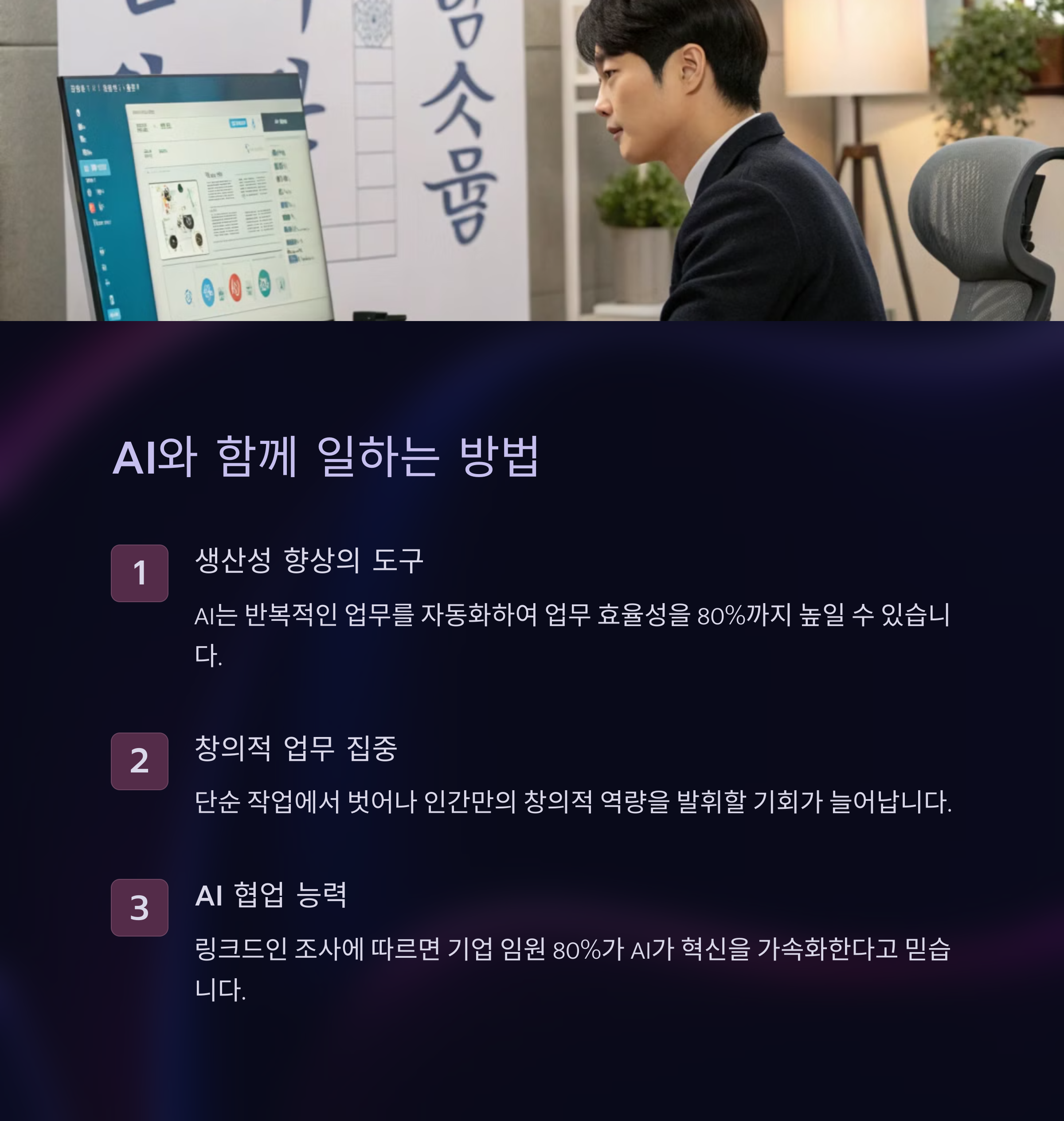 AI는 우리의 삶을 변화시키고 있으며, 이에 대비하는 것이 중요합니다. 새로운 기회를 탐색하고, 변화에 적응할 수 있는 능력을 기르는 것이 미래의 성공을 결정짓는 핵심 요소가 될 것입니다. 우리는 AI를 두려워하는 것이 아니라, 적극적으로 활용하는 방향으로 나아가야 합니다.