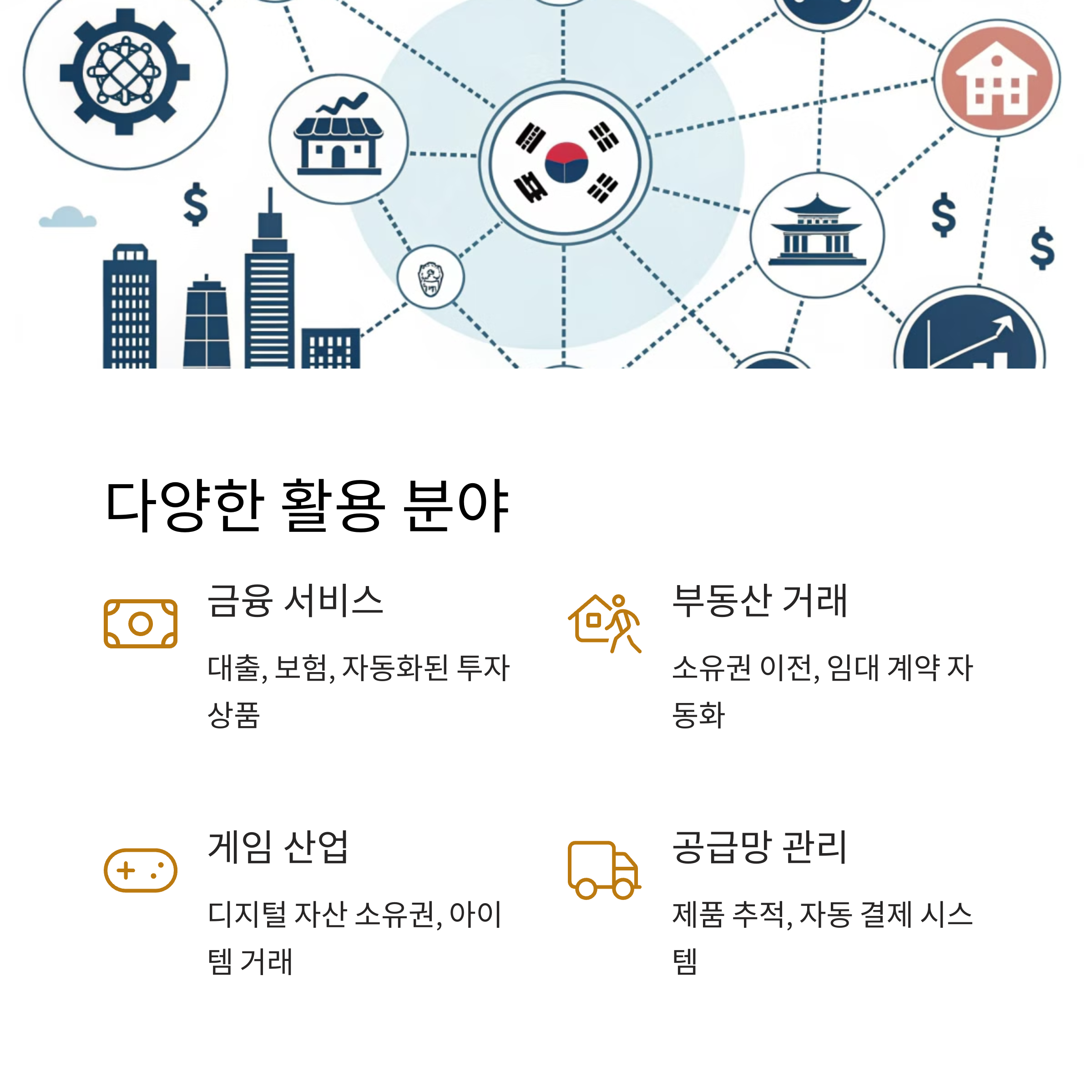 | 스마트 컨트랙트 | 블록체인에서 자동 실행되는 계약 | 이더리움 기반 계약 |