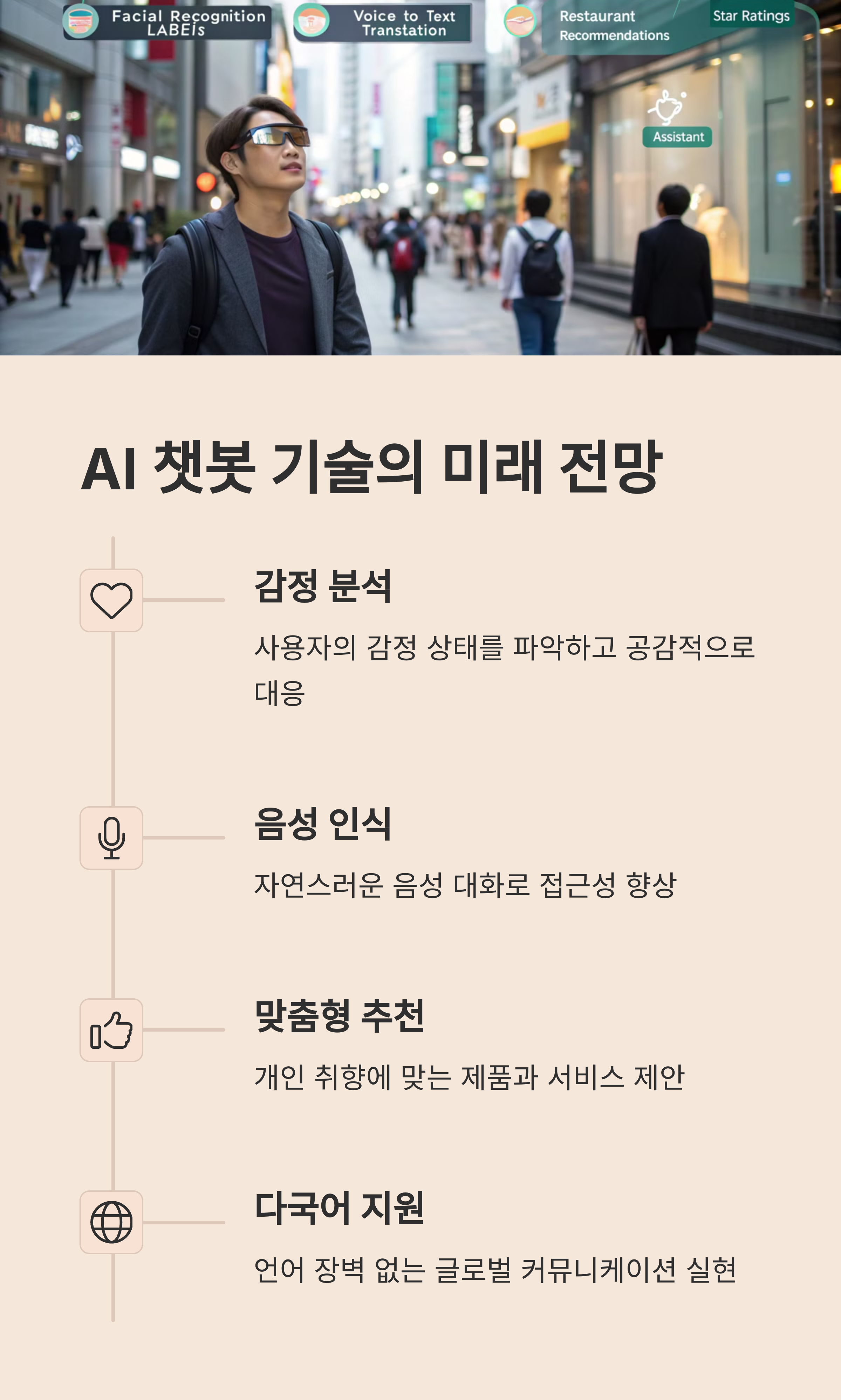 향후 AI 챗봇 기술은 더욱 발전하여 감정 분석, 음성 인식, 맞춤형 추천 시스템 등의 기능이 강화될 전망입니다. 이를 통해 보다 자연스럽고 인간적인 대화가 가능해지며, 개인화된 AI 어시스턴트의 역할을 수행할 것입니다.