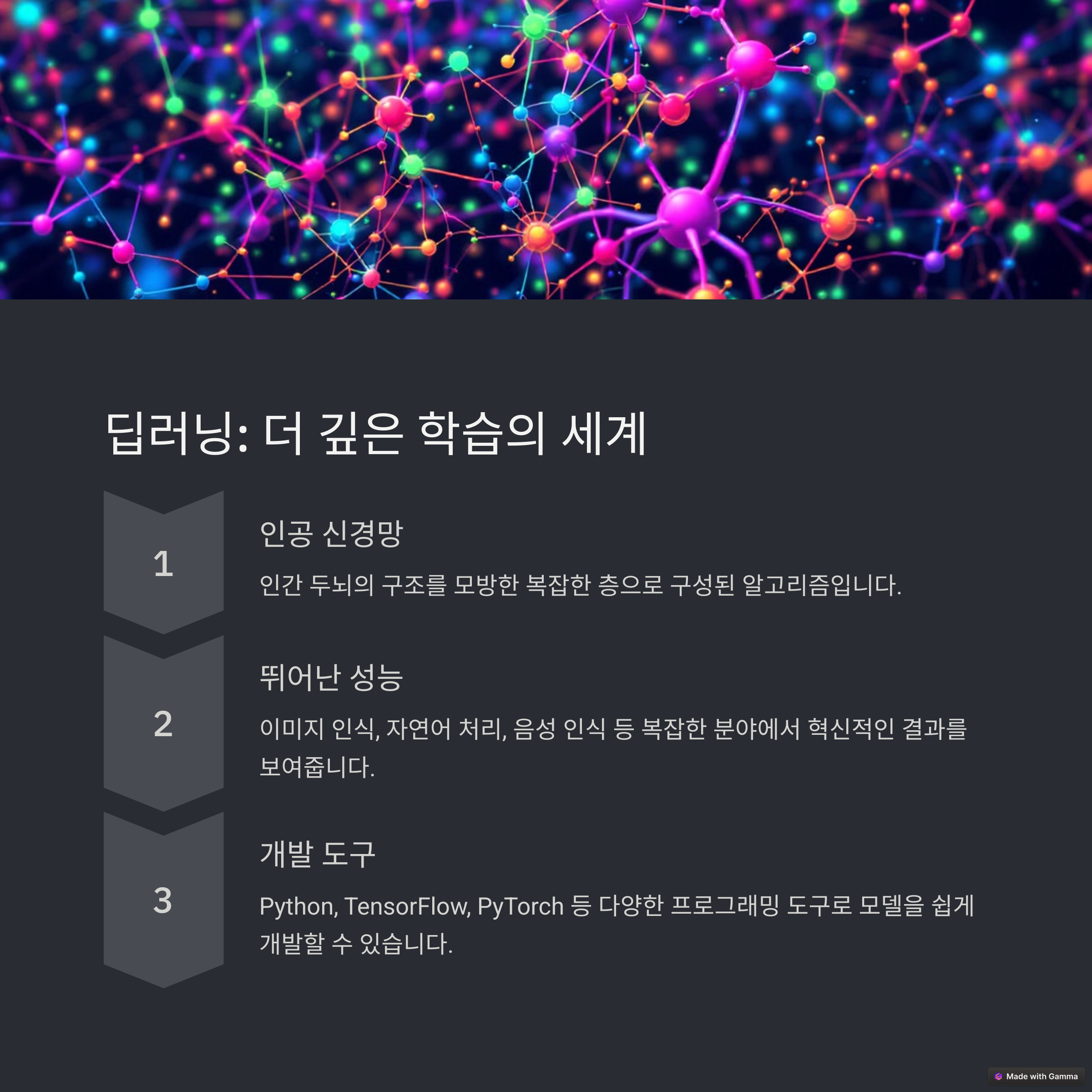 머신러닝의 핵심 개념은 크게 세 가지로 나눌 수 있습니다. 첫째, 지도 학습입니다. 이는 정답(label)이 주어진 데이터를 학습하는 방식으로, 이미지 분류, 음성 인식 등의 분야에서 널리 사용됩니다. 둘째, 비지도 학습입니다. 이는 정답이 없는 데이터에서 패턴을 찾는 방법으로, 클러스터링과 이상 탐지 등에 활용됩니다. 마지막으로 강화 학습은 환경과의 상호작용을 통해 최적의 행동을 학습하는 방식입니다.